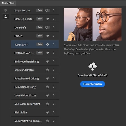 Six autres filtres neuronaux sont en version bêta et peuvent déjà être essayés. Pour huit filtres bêta, vous ne pouvez encore rien faire d'autre que de cliquer sur "Je suis intéressé". Je suppose qu'Adobe se laisse guider ici par les souhaits de ses clients.