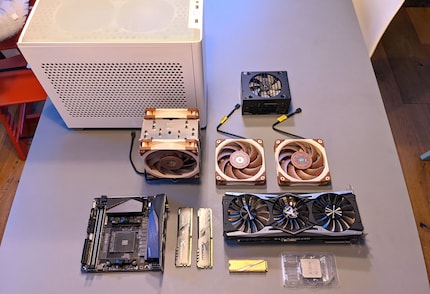 Pour garder le PC frais et silencieux malgré sa taille compacte, j'ai choisi l'énorme refroidisseur d'air NH-U12A de Noctua. Avec ses parois latérales en treillis, qui offrent une meilleure ventilation que la paroi de verre optionnelle, il s'emboîte de justesse à l'intérieur. En outre, je monte deux ventilateurs Noctua sur la couverture pour évacuer l'air chaud hors du boîtier. Les ventilateurs fournis jouent leur rôle, mais ceux de Noctua sont plus silencieux, aspect crucial pour un PC de salon vous en conviendrez. Le NR200 est un boîtier impressionnant grâce à ses panneaux latéraux amovibles. Les positions de l'alimentation électrique et des cartes graphiques sont flexibles. Et tout semble solide et stable. L'assemblage n'est pourtant pas une mince affaire. Et puis on a vu meilleure gestion des câbles.