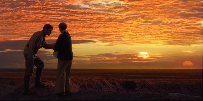 Dans la lumière rouge du double coucher de soleil de Tatooine, les parents adoptifs de Luke Skywalker se tournent vers un avenir meilleur ; un nouvel espoir.
