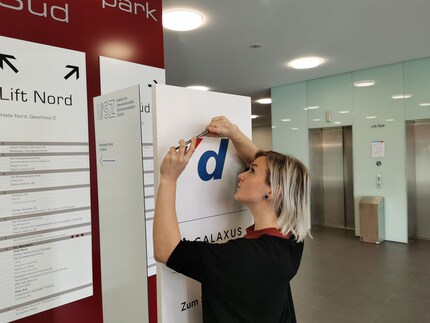 Avant d’aller dans le studio digitec où nous pouvons contrôler totalement la lumière, nous voulons faire encore un essai à la lumière naturelle. Dans le hall d’entrée des bureaux de digitec se trouve un panneau blanc avec le D bleu.