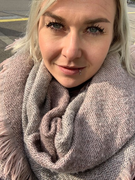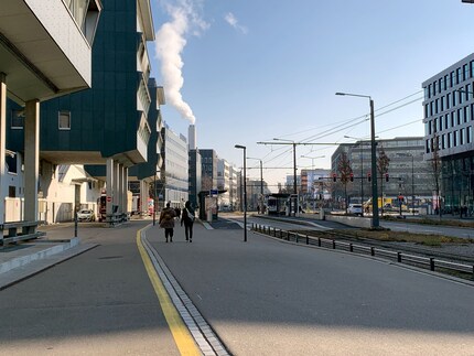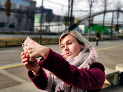 Jeanine se place au milieu de la rue entre le bâtiment de digitec et l’arrêt de tram et prend un selfie, comme elle le ferait habituellement.