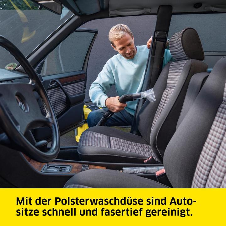 Le nettoyeur à vapeur SE 4001 Édition Limitée garantit une propreté en profondeur sur des surfaces textiles telles que les moquettes, les tissus d'ameublement, les escaliers recouverts de textile, les matelas, les tentures murales et les sièges de voiture. De l'eau du robinet fraîche et le nettoyant pour tapis Kärcher RM 519 sont pulvérisés sous pression profondément dans les surfaces textiles et aspirés avec la saleté dissoute. Cet appareil de nettoyage par injection-extraction est donc idéal pour les personnes allergiques et les foyers avec des animaux. Grâce à une technologie de buse innovante dans la buse de lavage de tapis ainsi que dans la buse de lavage de tissus, les surfaces nettoyées sont de 50 % plus rapidement accessibles. Le grand réservoir d'eau propre amovible de 4 litres est résistant aux chocs et translucide, ce qui facilite le remplissage et la vidange. L'eau sale aspirée s'accumule dans le réservoir de l'appareil. La poignée 3-en-1 permet un transport confortable, ainsi que l'ouverture, la fermeture et la vidange du réservoir. Le réservoir en plastique robuste offre la possibilité de ranger proprement le câble et les accessoires fournis. Grâce à l'éventail d'accessoires, l'appareil peut également être utilisé comme un aspirateur multifonction à part entière.
