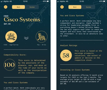 Visualizza tuttiIl mercato azionario è prevedibile come gli oroscopi in astrologia. Allora perché non combinare le due cose? L'agenzia creativa MSCHF ha programmato un'applicazione che fa proprio questo. "Bull & Moon" è il suo nome e il suo servizio sembra promettente. "Il nostro algoritmo proprietario di astrologia finanziaria consiglia un portafoglio ottimale di sei azioni e mostra il tuo punteggio di compatibilità con migliaia di altri titoli." Proviamo.