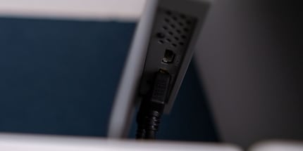 Anche i cavi che si attaccano alla parte inferiore del cavalletto per collegare il monitor al computer devono dare nell'occhio. Non c'è un posto dove nasconderli. Purtroppo, il monitor non dispone di una connessione USB-C o display port. Il cavo di alimentazione - che è collegato a un alimentatore esterno - e i cavi HDMI sono collegati alla parte inferiore del supporto. I controlli si trovano sul lato destro del supporto, mentre la connessione jack si trova a sinistra.