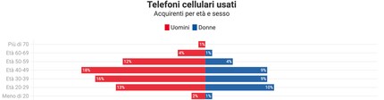 I cellulari usati piacciono soprattutto alle donne: più di un terzo degli acquirenti di cellulari usati di digitec e Galaxus sono donne. Per i nuovi dispositivi, la cifra è di poco inferiore a un quarto. E le differenze si riscontrano anche nella distribuzione per età: per nuovi cellulari, il gruppo più numeroso di acquirenti è costituito dalla fascia d’età 30-39 anni, mentre per i cellulari usati la maggior parte degli acquirenti ha un'età compresa tra i 40 e i 49 anni.