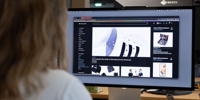 Tobias spiega: «Purtroppo non è così semplice. Non per niente abbiamo un intero team che si occupa della visualizzazione dei nostri negozi online. Il nostro team di framework ‹Infinity› è composto principalmente da cosiddetti sviluppatori front-end che si occupano del layout generale del sito web di Digitec Galaxus. Questo include, ad esempio, l'area dell'intestazione della pagina web, le colonne laterali e l'area del piè di pagina in basso. Questi e tutti gli altri componenti del negozio online hanno bisogno di un colore predefinito. Gli schemi di colore predefiniti sono chiamati ‹temi›. Digitec e Galaxus utilizzano due temi distinti che corrispondono ai colori dei rispettivi loghi. Digitec è composto da molti blu e rossi e ha una barra blu in alto. Galaxus ha diversi colori sul bordo superiore e per il resto è più bianco, nero e grigio».