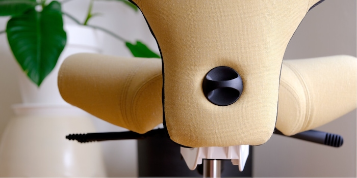 La superficie di seduta a forma di sella è insolita ma non scomoda. Rende quasi impossibile accavallare le gambe. Anche se ci provo per abitudine, non riesco a mantenere a lungo questa posizione. Va bene così, in questo modo non sono incentivata a mantenere vecchi vizi. La posizione da cavallerizza è solo una delle tante in cui posso stare. Posso sedermi attivamente davanti o comodamente dietro. Con il mio rialzo per lavorare in piedi mi siedo mezzo in piedi, di lato o all'indietro – con lo schienale davanti al petto. L'unica cosa che devo ricordare è di tirare il freno di emergenza sul lato destro del sedile, che mi impedisce di dondolare e cadere in avanti.