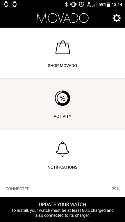 Anche l'aggiornamento del software dell'orologio è problematico. Durante la trasmissione wireless dei dati possono verificarsi dei problemi e l'aggiornamento non va a buon fine. Per quanto concerne l'app del Movado Bold Motion, sembra che il processo di aggiornamento funzioni solo in casi eccezionali o non funzioni affatto, anche mettendo lo smartphone proprio accanto all'orologio. Sorprende il fatto che, in questo caso, l'app richiede lo status "Orologio collegato mediante cavo dati". Ricordiamoci che per ricaricare l'orologio bisogna collegarlo al PC, ossia con un apparecchio che possa trasmettere dati mediante porta USB. Per quale motivo non sia possibile effettuare l'aggiornamento via cavo, resta un mistero.