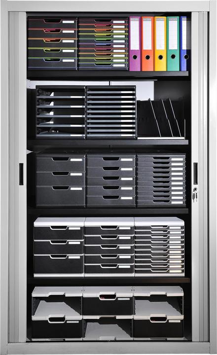 Scatola per cassetti Modulo A4, 10 cassetti aperti. Modulo è un pratico sistema di archiviazione modulare di Exacompta. I prodotti della serie sono più di semplici scatole per cassetti. Si tratta di un sistema di archiviazione completamente modulabile, che si adatta alle vostre esigenze e non viceversa. Tutti i prodotti hanno una superficie strutturata antistatica e sono coperti da una garanzia di 25 anni. La scatola per cassetti è un'archiviazione elegante e funzionale per formati DIN A4+. I contenitori hanno la stessa altezza dei raccoglitori e possono essere collegati orizzontalmente e verticalmente (compatibili con Modulo A4 e A3). Con cassetti aperti, in modo che il materiale da archiviare possa essere inserito facilmente senza aprire i cassetti, e con una guida dei cassetti leggera come una piuma, dotata di un meccanismo di arresto unico e di un pratico elemento di presa per una facile maneggevolezza. Nella confezione sono inclusi elementi per etichettatura, collegamento e produzione. La scatola per cassetti è ecologica e certificata con il marchio Blauer Engel.