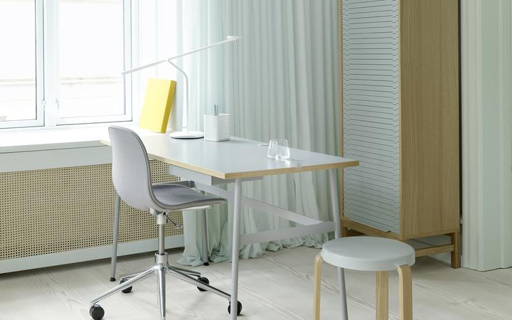Scrivania Journal. Si ispira in modo purista agli spogli studi degli anni '60: Simon Legald crea per il marchio danese Normann Copenhagen un design chiaro e lineare che stimola il pensiero. Per evitare che piccoli oggetti interrompano il flusso delle idee, la scrivania presenta dettagli ingegnosi: una passacavi nel piano del tavolo raccoglie ordinatamente tutti i cavi, mentre il piccolo cassetto offre spazio per gli accessori da scrivania senza compromettere la libertà di movimento delle gambe. Inoltre, la scrivania Journal, con le sue dimensioni compatte, si presta a combinazioni eleganti in qualsiasi ambiente, soprattutto perché Normann Copenhagen offre il tavolo in tonalità tono su tono con colori sobrii e abitabili, sia per il piano laminato resistente che per la struttura in acciaio.